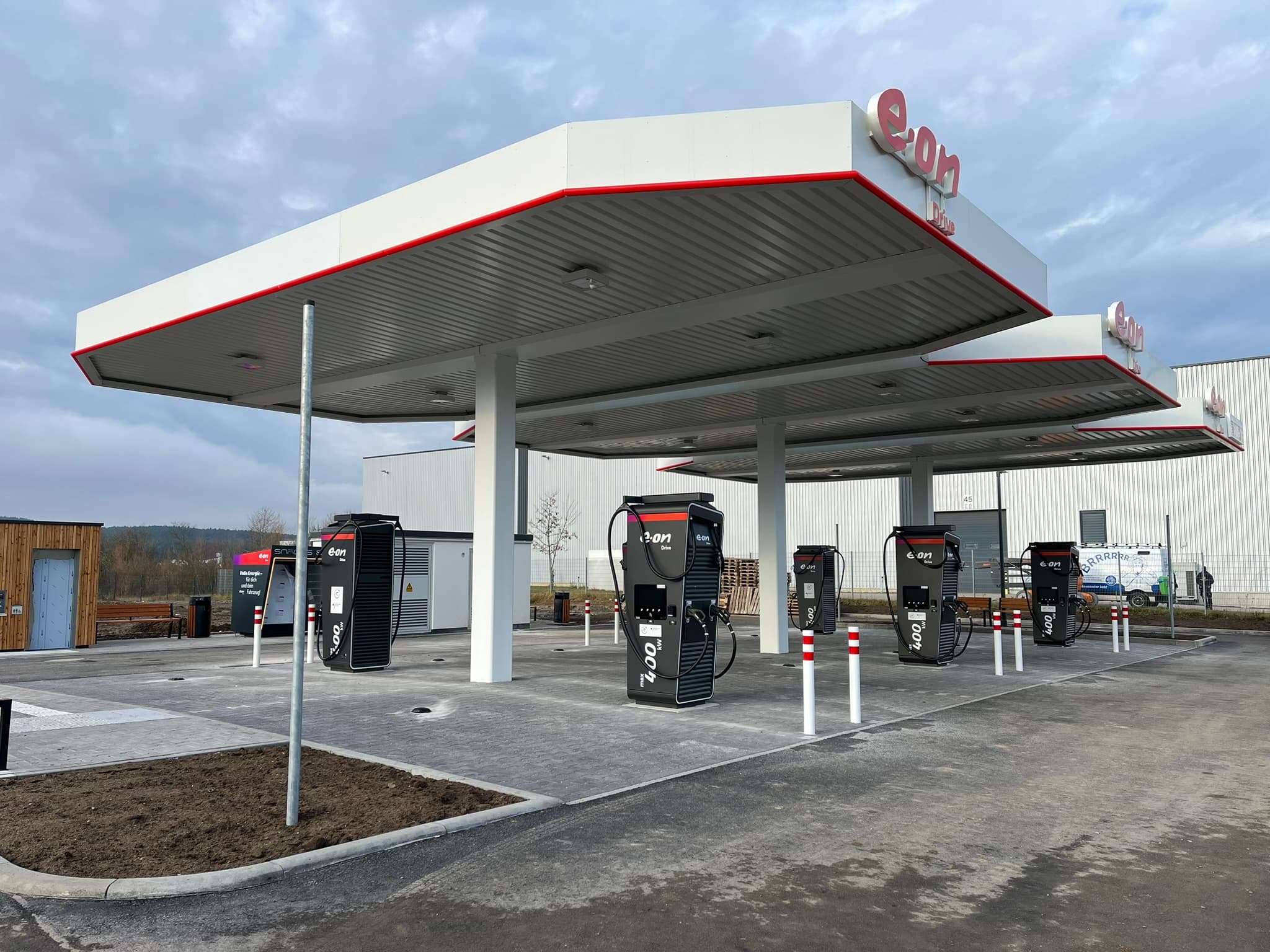 E.ON nimmt im oberfränkischen Bindlach bei Bayreuth im Rahmen des Deutschlandnetzes des Bundesministeriums für Verkehr (BMV) sechs Schnellladesäulen mit jeweils zwei Ladepunkten in Betrieb. Zwölf E-Fahrzeuge können mit mindestens 200 kW und bis zu 400 kW Ladeleistung geladen werden. Moderne E-Autos sind damit innerhalb von rund 20 Minuten bereit für die nächste Fahretappe.