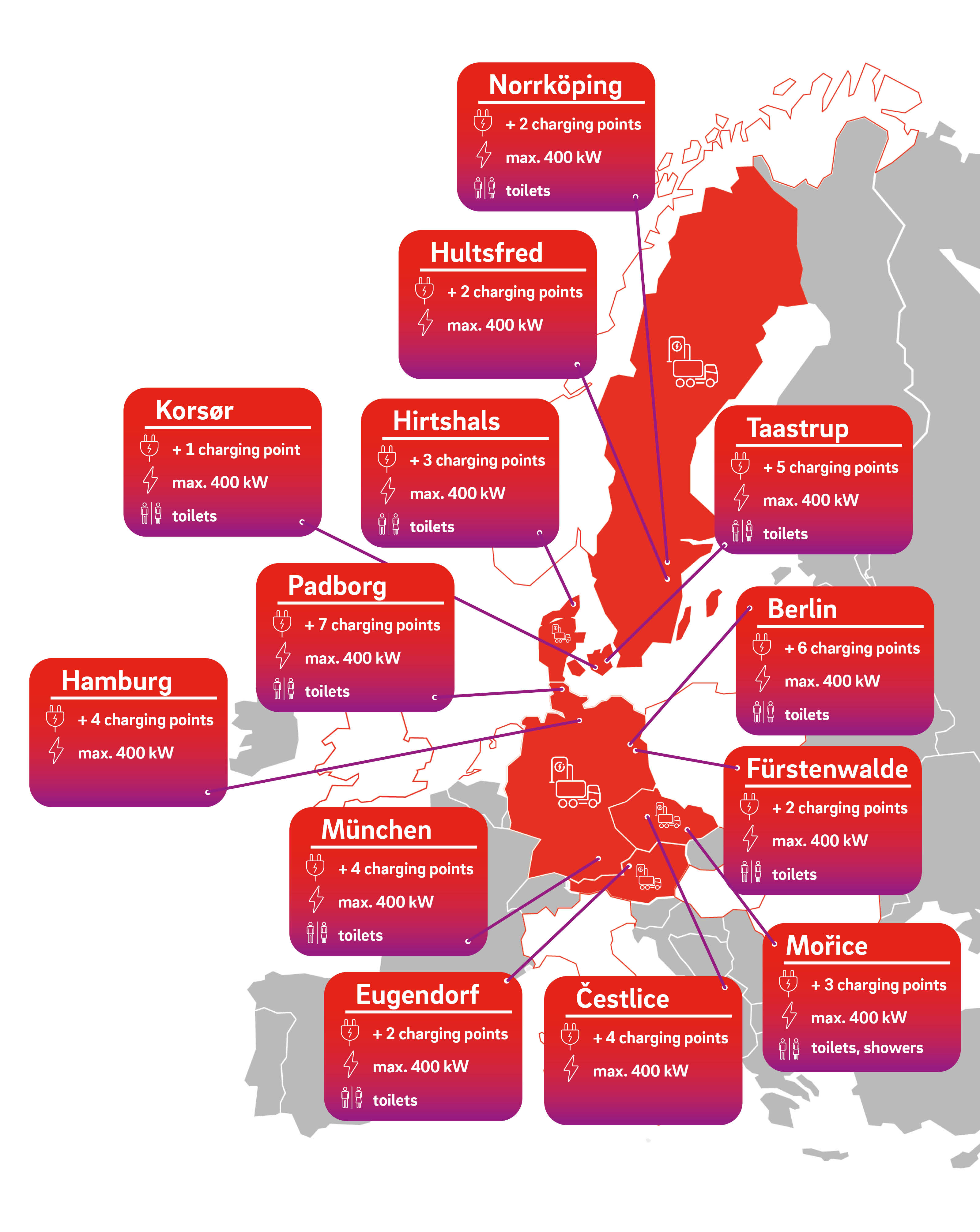 Vårt nätverk växer kontinuerligt längs Europas viktigaste transportstråk. I dag är vi verksamma i Tyskland, Sverige och Danmark, och många fler high-power-laddplatser kommer snart.